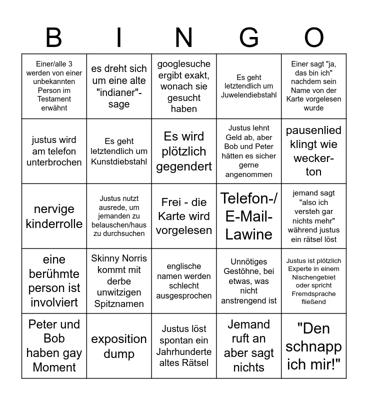 This bingo card has a free space and 46 words: Bob kriegt eine gewummst, "Den schnapp ich mir!", Leute sind grundlos extrem unfreundlich, Justus löst spontan ein Jahrhunderte altes Rätsel, Skinny Norris kommt mit derbe unwitzigen Spitznamen, Peters Dietrich Set wird genutzt, es dreht sich um eine alte "indianer"-sage, Schwerverbrecher nutzen trotzdem jugendfreie Schimpfwörter, justus wird am telefon unterbrochen, Pausen Lied ballert hart, Es geht letztendlich um Kunstdiebstahl, Es geht letztendlich um Juwelendiebstahl, Justus ist plötzlich Experte in einem Nischengebiet oder spricht Fremdsprache fließend, Unnötiges Gestöhne, bei etwas, was nicht anstrengend ist, Geschehen wird laut beschrieben, was unnatürlich klingt, Peter stellt sich bei einem Fremdwort extrem dumm an, Es wird plötzlich gegendert, Telefon-/ E-Mail-Lawine, "Einfach aufgelegt!", Einer sagt "ja, das bin ich" nachdem sein Name von der Karte vorgelesen wurde, Justus nutzt ausrede, um jemanden zu belauschen/haus zu durchsuchen, Jemand ruft an aber sagt nichts, Einer/alle 3 werden von einer unbekannten Person im Testament erwähnt, Justus lehnt Geld ab, aber Bob und Peter hätten es sicher gerne angenommen, Die drei geben sich als Studenten aus, pausenlied klingt wie wecker-ton, Peter und Bob haben gay Moment, die "jugendlichen" nutzen altbackene alman-sprüche, englische namen werden schlecht ausgesprochen, eine berühmte person ist involviert, sie werden von auto beschattet oder verfolgt, bobs "recherche" besteht aus wikipedia fakten, peter glaubt wirklich alles, einer erschreckt sich, weil die anderen in den raum platzen, schlecht geschriebene, nervige frauenrolle, exposition dump, jemand sagt "also ich versteh gar nichts mehr" während justus ein rätsel löst, die drei werden mit essen/trinken betäubt oder vergiftet, folge endet mit gelächter, jemand bricht in zentrale ein, peter jammert, googlesuche ergibt exakt, wonach sie gesucht haben, nervige kinderrolle, bankräuber auf der flucht, (alle 3 gleichzeitig) "inspektor cotta?!" and bösewicht erklärt seine motivation ausführlich.