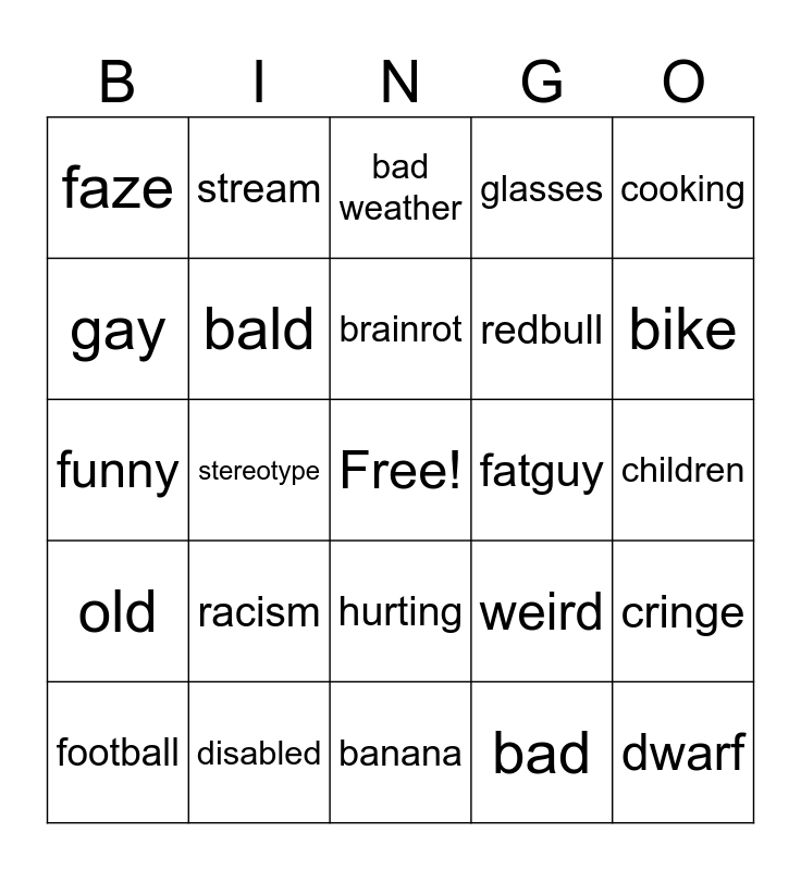 This bingo card has a free space and 24 words: racism, disabled, brainrot, football, cooking, faze, gay, stream, fatguy, hurting, redbull, funny, weird, cringe, bald, bad, children, bad weather, bike, stereotype, dwarf, old, glasses and banana.