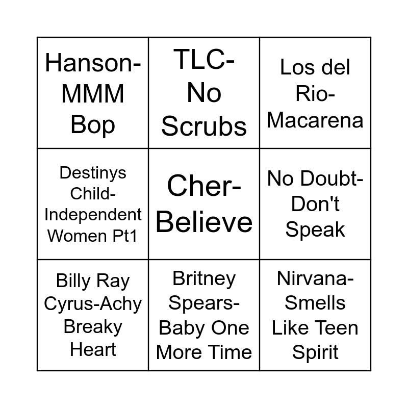 This bingo card has 40 words: Ace of Base-All that She Wants, Alanis Morrissette-Ironic, Anna Lee-2 Times, Billy Ray Cyrus-Achy Breaky Heart, Blur-Parklife, Boyzone-Picture of You, Britney Spears-Baby One More Time, B-Witched-C'est La Vie, Cher-Believe, Chesney Hawkes-The One and Only, Des'ree-Life, Destinys Child-Independent Women Pt1, Will Smith & DJ Jazzy Jeff-Boom Shake the Room, Eiffel 65-Blue (Da Ba Dee), Five-Everybody Get Up, Gala-Freed From Desire, Gina G-Ooh aah...Just a Little Bit, Hanson-MMM Bop, LeAnn Rimes-Can't fight the Moonlight, Los del Rio-Macarena, Lou Bega- Mambo No.5 (A Little Bit of.., MC Hammer-U Can't Touch This, Nirvana-Smells Like Teen Spirit, No Doubt-Don't Speak, Oasis-Wonderwall, Ocean Colour Scene- The Day We Caught The Train, Outhere Brothers-Boom Boom Boom, Peter Andre-Mysterious Girl, Radiohead-Creep, Rednex-Cotton Eyed Joe, Ricky Martin-Livin'la Vida Loca, Robbie Williams-Angels, S Club 7- Bring it All Back, Snap-Rhythmn is a Dancer, Spice Girls-Stop, Steps-5,6,7,8, The Offspring-Pretty Fly (For a White Guy), The Rembrandts-I'll Be There For You, TLC-No Scrubs and Vengaboys-Boom, Boom, Boom, Boom!.