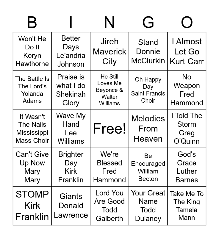 This bingo card has a free space and 39 words: God's Got A Blessing Norman Hutchins, I Just Wanna Praise You Maurette Brown Clark, God Favored Me Hezekiah Walker, Praise is what I do Shekinah Glory, STOMP Kirk Franklin, We're Blessed Fred Hammond, He Still Loves Me Beyonce & Walter Williams, I Give Myself Away William McDowell, I Almost Let Go Kurt Carr, Can't Give Up Now Mary Mary, Wave My Hand Lee Williams, Stand Donnie McClurkin, Take Me To The King Tamela Mann, I Told The Storm Greg O'Quinn, Melodies From Heaven, Brighter Day Kirk Franklin, On Time God Dottie Peoples, Won't He Do It Koryn Hawthorne, Long As I Got King Jesus Vickie Winan, Be Encouraged William Becton, The Battle Is The Lord's Yolanda Adams, Lord You Are Good Todd Galberth, Oh Happy Day Saint Francis Choir, No Weapon Fred Hammond, Amazing Ricky Dillard, Freedom Eddie James, Break Every Chain Tasha Cobbs Leonard, Way Maker Sinach, You're Bigger Jekayln Carr, Better Days Le'andria Johnson, Only God Can Do It Renee Winston, Praise Elevation Worship, Jireh Maverick City, Giants Donald Lawrence, Your Great Name Todd Dulaney, You Are Kierra Sheard, God's Grace Luther Barnes, It Wasn't The Nails Mississippi Mass Choir and He'll Welcome Me John P Kee.
