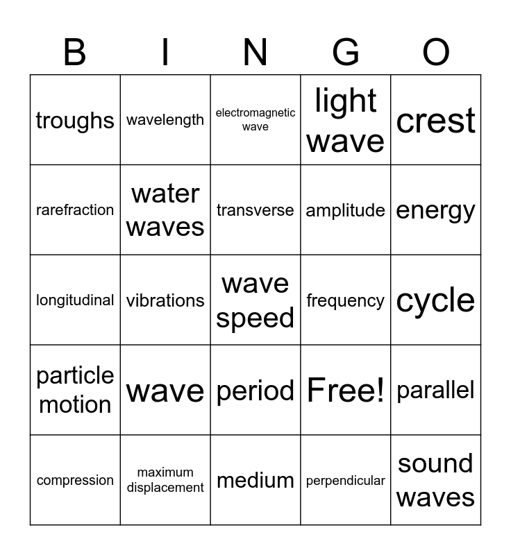 This bingo card has 25 words: wave, medium, transverse, compression, crest, troughs, rarefraction, wavelength, frequency, period, amplitude, longitudinal, Free!, parallel, water waves, sound waves, cycle, electromagnetic wave, energy, vibrations, wave speed, maximum displacement, particle motion, light wave and perpendicular.