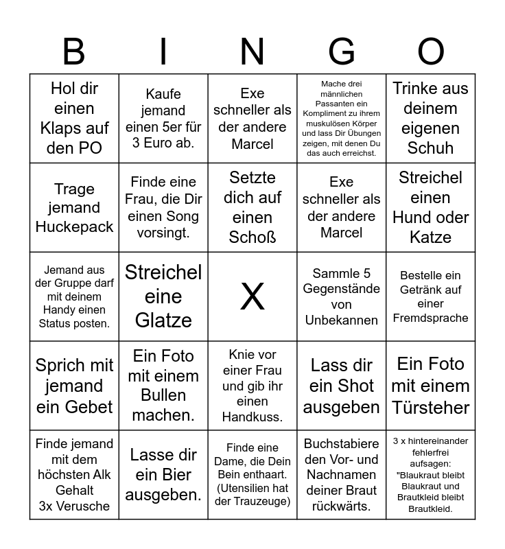 This bingo card has a free space and 24 words: Ein Foto mit einem Bullen machen., Lasse dir ein Bier ausgeben., Setzte dich auf einen Schoß, Finde jemand mit dem höchsten Alk Gehalt 3x Verusche, Trinke aus deinem eigenen Schuh, Hol dir einen Klaps auf den PO, Trage jemand Huckepack, Kaufe jemand einen 5er für 3 Euro ab., Sammle 5 Gegenstände von Unbekannen, Knie vor einer Frau und gib ihr einen Handkuss., Exe schneller als der andere Marcel, Jemand aus der Gruppe darf mit deinem Handy einen Status posten., Lass dir ein Shot ausgeben, Ein Foto mit einem Türsteher, Finde eine Frau, die Dir einen Song vorsingt., Buchstabiere den Vor- und Nachnamen deiner Braut rückwärts., Bestelle ein Getränk auf einer Fremdsprache, Exe schneller als der andere Marcel, Streichel einen Hund oder Katze, Streichel eine Glatze, 3 x hintereinander fehlerfrei aufsagen: "Blaukraut bleibt Blaukraut und Brautkleid bleibt Brautkleid., Sprich mit jemand ein Gebet, Mache drei männlichen Passanten ein Kompliment zu ihrem muskulösen Körper und lass Dir Übungen zeigen, mit denen Du das auch erreichst. and Finde eine Dame, die Dein Bein enthaart. (Utensilien hat der Trauzeuge).
