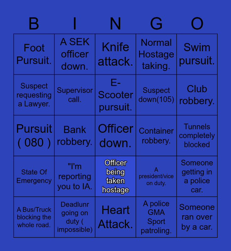 This bingo card has a free space and 31 words: Heart Attack., Suspect admitting guilt., Bank robbery., Suspect saying "self Defence", Foot Pursuit., Knife attack., Supervisor call., A president/vice on duty., Container robbery., A police GMA Sport patroling., Tunnels completely blocked, Someone ran over by a car., Panic button., IA on duty., Club robbery., 0 Rookies on duty., Someone getting in a police car., "I'm reporting you to IA., State Of Emergency, Officer being taken hostage, Swim pursuit., A random car parked in the middle of the road., A Bus/Truck blocking the whole road., A SEK officer down., Suspect down(105), Suspect requesting a Lawyer., Normal Hostage taking., Pursuit ( 080 ), Deadlunr going on duty ( impossible), E-Scooter pursuit. and Jeweler robbery..