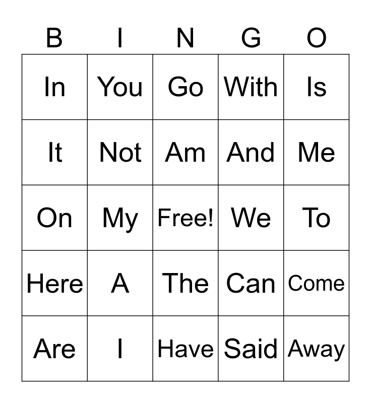 This bingo card has a free space and 24 words: A, I, Am, Are, Is, In, It, You, We, The, And, On, Can, Come, Not, Said, To, Go, Me, My, Away, Here, With and Have.