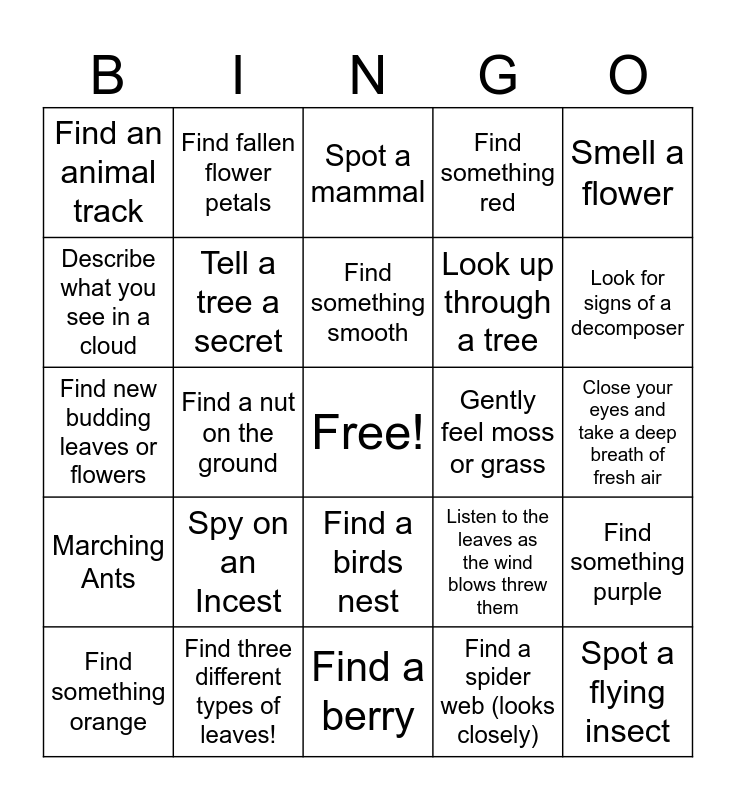This bingo card has a free space and 30 words: Find three different types of leaves!, Touch a thorn (gently), Find a nut on the ground, Find a falling branch, Find an animal track, Spot a mammal, Tell a tree a secret, Find a birds nest, Gently feel moss or grass, Find a berry, Close your eyes and take a deep breath of fresh air, Spot a flying insect, Find a spider web (looks closely), Find an animal habitat, Look for signs of a decomposer, Feel the texture of three different trees, Listen to the leaves as the wind blows threw them, Marching Ants, Spy on an Incest, Smell a flower, Find new budding leaves or flowers, Find something you don’t know, Find fallen flower petals, Look up through a tree, Describe what you see in a cloud, Find something red, Find something purple, Find something orange, Find something smooth and Find something sharp.