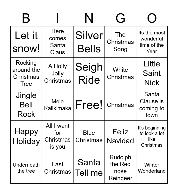 This bingo card has a free space and 24 words: All I want for Christmas is you, Last Christmas, Seigh Ride, Underneath the tree, Its the most wonderful time of the Year, Let it snow!, Rocking around the Christmas Tree, Here comes Santa Claus, Christmas, Blue Christmas, White Christmas, Jingle Bell Rock, Feliz Navidad, It's beginning to look a lot like Christmas, A Holly Jolly Christmas, Rudolph the Red nose Reindeer, Santa Clause is coming to town, Silver Bells, Little Saint Nick, Mele Kalikimaka, Winter Wonderland, Happy Holiday, The Christmas Song and Santa Tell me.