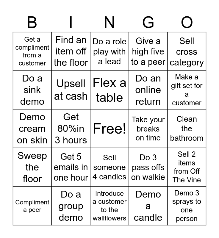 This bingo card has a free space and 24 words: Get 5 emails in one hour, Do a group demo, Flex a table, Compliment a peer, Sell cross category, Get a compliment from a customer, Do a sink demo, Find an item off the floor, Take your breaks on time, Sell someone 4 candles, Do an online return, Demo cream on skin, Do 3 pass offs on walkie, Sell 2 items from Off The Vine, Upsell at cash, Demo a candle, Clean the bathroom, Do a role play with a lead, Make a gift set for a customer, Get 80%in 3 hours, Demo 3 sprays to one person, Sweep the floor, Give a high five to a peer and Introduce a customer to the wallflowers.