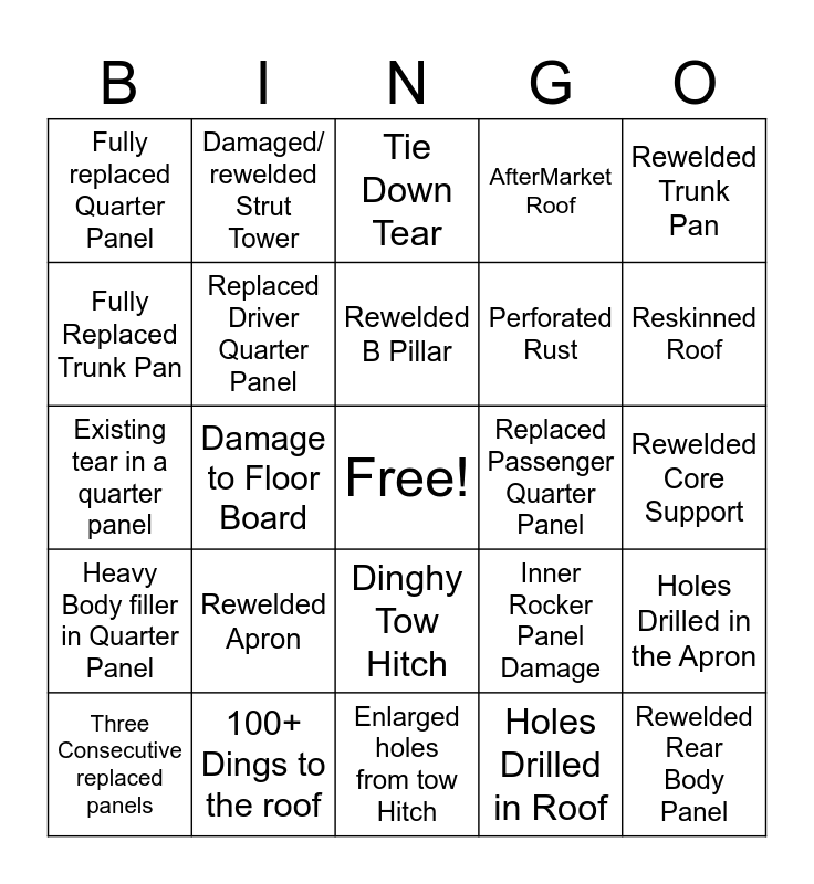 This bingo card has a free space and 24 words: Rewelded Apron, 100+ Dings to the roof, Rewelded B Pillar, Three Consecutive replaced panels, Rewelded Trunk Pan, Fully replaced Quarter Panel, Fully Replaced Trunk Pan, Damaged/ rewelded Strut Tower, Replaced Passenger Quarter Panel, Dinghy Tow Hitch, Perforated Rust, Existing tear in a quarter panel, Inner Rocker Panel Damage, Holes Drilled in the Apron, Replaced Driver Quarter Panel, Holes Drilled in Roof, Rewelded Core Support, Tie Down Tear, Reskinned Roof, Damage to Floor Board, Rewelded Rear Body Panel, Heavy Body filler in Quarter Panel, AfterMarket Roof and Enlarged holes from tow Hitch.