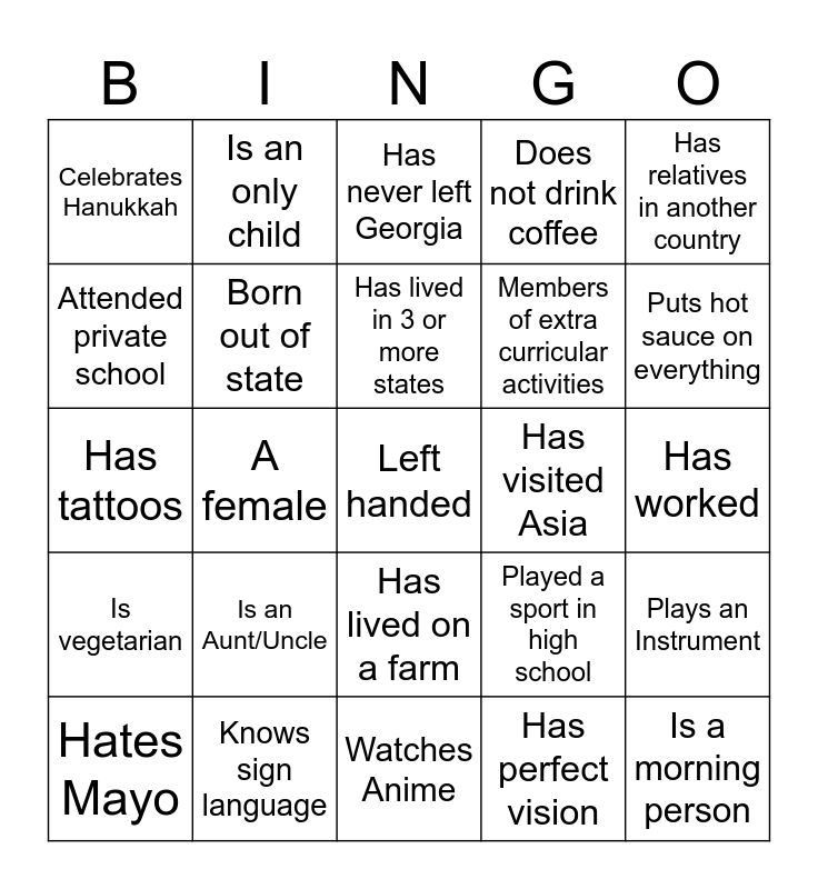 This bingo card has 25 words: Is an Aunt/Uncle, Watches Anime, Has lived in 3 or more states, Hates Mayo, Has relatives in another country, Celebrates Hanukkah, Attended private school, Is an only child, Has visited Asia, Has lived on a farm, Members of extra curricular activities, Has tattoos, Played a sport in high school, Plays an Instrument, Born out of state, Is a morning person, Has worked, Has never left Georgia, Puts hot sauce on everything, A female, Left handed, Knows sign language, Is vegetarian, Does not drink coffee and Has perfect vision.