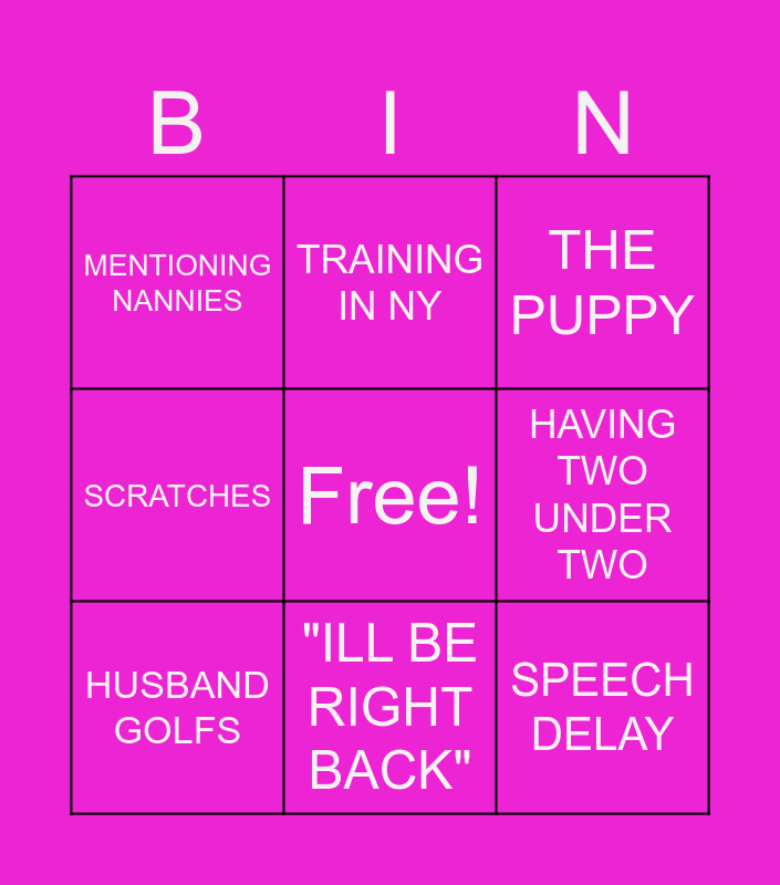 This bingo card has a free space and 8 words: HAVING TWO UNDER TWO, THE PUPPY, TRAINING IN NY, HUSBAND GOLFS, MENTIONING NANNIES, SPEECH DELAY, SCRATCHES and "ILL BE RIGHT BACK".