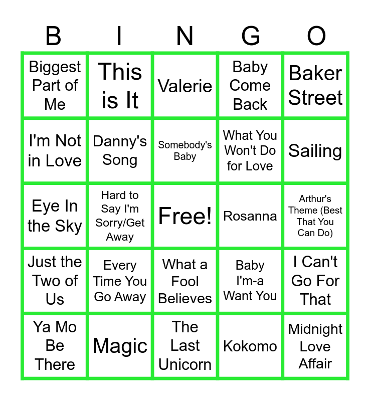 This bingo card has a free space and 24 words: Every Time You Go Away, Magic, Somebody's Baby, Ya Mo Be There, Baker Street, Biggest Part of Me, I'm Not in Love, This is It, Rosanna, What a Fool Believes, What You Won't Do for Love, Eye In the Sky, Baby I'm-a Want You, I Can't Go For That, Danny's Song, Kokomo, Arthur's Theme (Best That You Can Do), Valerie, Sailing, Hard to Say I'm Sorry/Get Away, Midnight Love Affair, Just the Two of Us, Baby Come Back and The Last Unicorn.