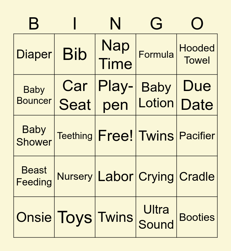 This bingo card has a free space and 24 words: Nursery, Toys, Play-pen, Onsie, Hooded Towel, Diaper, Baby Bouncer, Bib, Twins, Labor, Baby Lotion, Baby Shower, Crying, Cradle, Car Seat, Ultra Sound, Pacifier, Nap Time, Due Date, Teething, Booties, Beast Feeding, Formula and Twins.