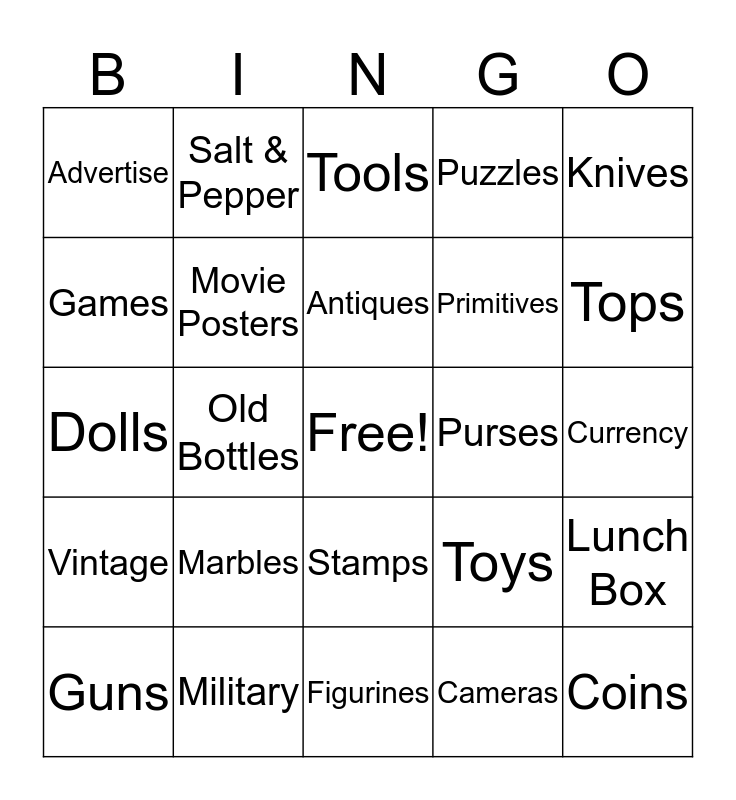 This bingo card has a free space and 24 words: Marbles, Military, Antiques, Guns, Knives, Advertise, Games, Salt & Pepper, Purses, Stamps, Primitives, Dolls, Toys, Lunch Box, Movie Posters, Cameras, Currency, Tools, Tops, Old Bottles, Coins, Vintage, Puzzles and Figurines.