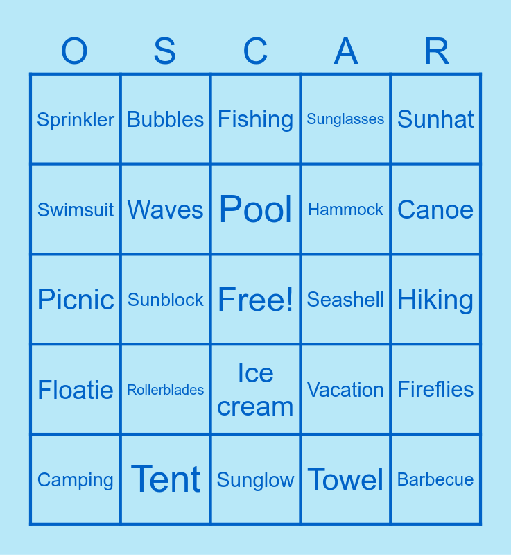 This bingo card has a free space and 35 words: Sunshine, Beach, Sand, Waves, Ice cream, Sunglasses, Swimsuit, Flip-flops, Pool, Watermelon, Picnic, Sunhat, Popsicle, Lemonade, Sprinkler, Seashell, Towel, Sunblock, Floatie, Barbecue, Vacation, Camping, Fireflies, Tent, Fishing, Canoe, Ocean, Breeze, Hammock, Hiking, Scooter, Sunglow, Rollerblades, Bubbles and Sandcastle.