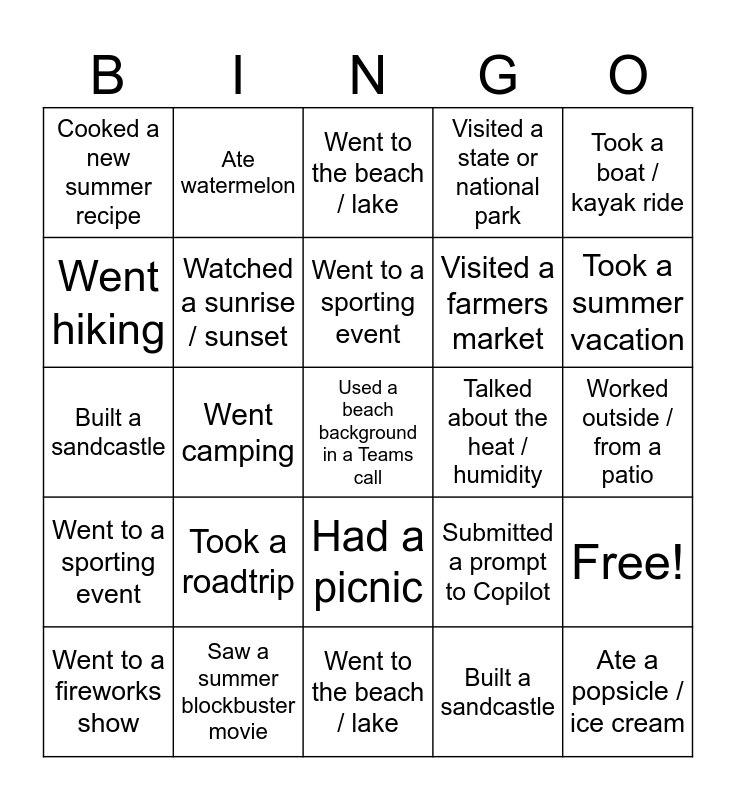 This bingo card has 51 words: Took a summer vacation, Used a beach background in a Teams call, Went to a fireworks show, Went to the beach / lake, Took a roadtrip, Went to an outdoor concert / movie, Ate watermelon, Grilled out or had a BBQ, Went hiking, Saw a summer blockbuster movie, Watched a sunrise / sunset, Visited a state or national park, Free!, Submitted a prompt to Copilot, Shared a vacation photo in a Teams chat, Worked outside / from a patio, Went to a sporting event, Talked about the heat / humidity, Used sunscreen or bug spray, Took a boat / kayak ride, Went camping, Built a sandcastle, Cooked a new summer recipe, Visited a farmers market, Had a picnic, Ate a popsicle / ice cream, Took a summer vacation, Used a beach background in a Teams call, Went to a fireworks show, Went to the beach / lake, Took a roadtrip, Went to an outdoor concert / movie, Ate watermelon, Grilled out or had a BBQ, Went hiking, Saw a summer blockbuster movie, Watched a sunrise / sunset, Visited a state or national park, Submitted a prompt to Copilot, Shared a vacation photo in a Teams chat, Worked outside / from a patio, Went to a sporting event, Talked about the heat / humidity, Used sunscreen or bug spray, Took a boat / kayak ride, Went camping, Built a sandcastle, Cooked a new summer recipe, Visited a farmers market, Had a picnic and Ate a popsicle / ice cream.