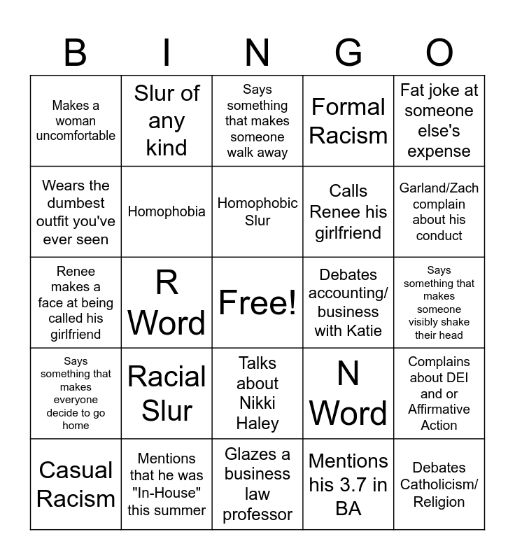 This bingo card has a free space and 24 words: Racial Slur, Mentions that he was "In-House" this summer, Homophobic Slur, Casual Racism, Fat joke at someone else's expense, Makes a woman uncomfortable, Wears the dumbest outfit you've ever seen, Slur of any kind, Debates accounting/ business with Katie, Talks about Nikki Haley, Calls Renee his girlfriend, Renee makes a face at being called his girlfriend, N Word, Complains about DEI and or Affirmative Action, Homophobia, Mentions his 3.7 in BA, Says something that makes someone visibly shake their head, Says something that makes someone walk away, Garland/Zach complain about his conduct, R Word, Debates Catholicism/ Religion, Says something that makes everyone decide to go home, Formal Racism and Glazes a business law professor.