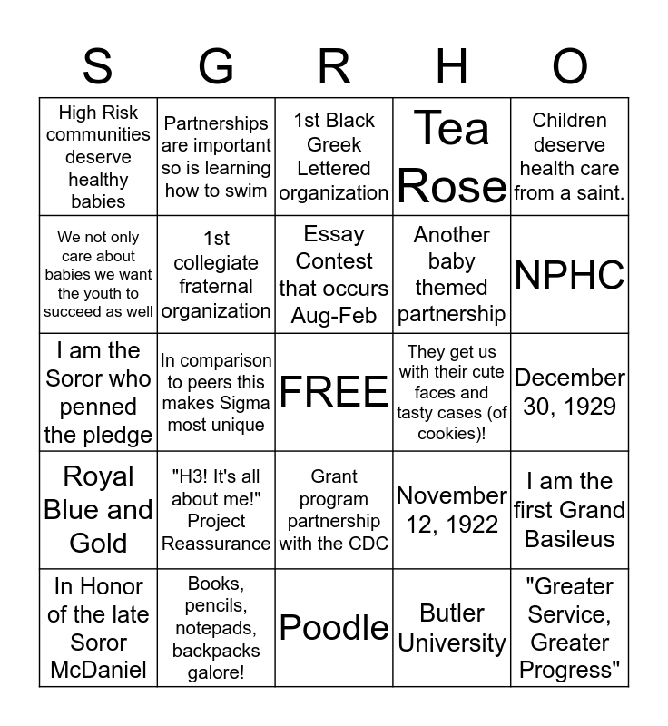 This bingo card has a free space and 24 words: "H3! It's all about me!" Project Reassurance, Books, pencils, notepads, backpacks galore!, Essay Contest that occurs Aug-Feb, In Honor of the late Soror McDaniel, Children deserve health care from a saint., High Risk communities deserve healthy babies, We not only care about babies we want the youth to succeed as well, Partnerships are important so is learning how to swim, They get us with their cute faces and tasty cases (of cookies)!, Grant program partnership with the CDC, Another baby themed partnership, I am the Soror who penned the pledge, November 12, 1922, I am the first Grand Basileus, 1st collegiate fraternal organization, Butler University, December 30, 1929, 1st Black Greek Lettered organization, NPHC, In comparison to peers this makes Sigma most unique, "Greater Service, Greater Progress", Royal Blue and Gold, Tea Rose and Poodle.