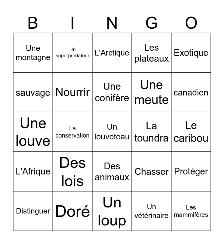 This bingo card has 25 words: Des lois, Un loup, Une conifère, Distinguer, Exotique, Une montagne, sauvage, Un superprédateur, La toundra, Des animaux, Une meute, Une louve, Chasser, Protéger, Nourrir, Les mammifères, Le caribou, L'Arctique, canadien, La conservation, Un louveteau, Doré, L'Afrique, Les plateaux and Un vétérinaire.