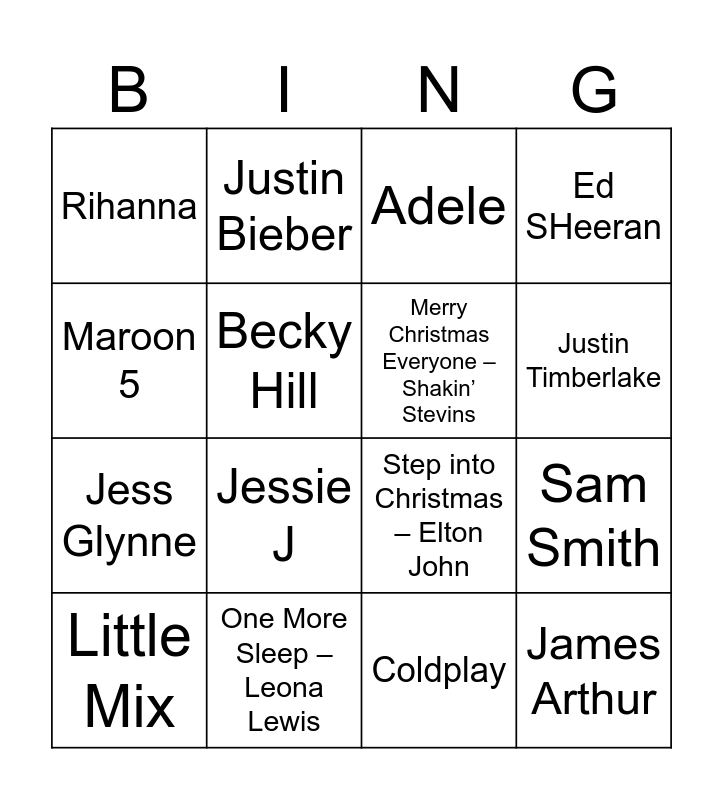 This bingo card has 67 words: Pink, Usher, Myles Smith, Flo Rida, Black Eyed Peas, Harry Styles, Justin Bieber, Benson Boone, Justin Timberlake, Katy Perry, Lady Gaga, Taylor Swift, Coldplay, Maroon 5, Lewis Capaldi, Becky Hill, Sam Smith, Rihanna, The Weeknd, Jess Glynne, One Direction, James Arthur, Ed SHeeran, Adele, Jason Derulo, Britney Spears, David GUetta, Olly Murs, Jessie J, Ellie Goulding, Little Mix, Anne-Marie, Last Christmas – Wham, Underneath the Tree – Kelly Clarkson, Do they Know It’s Christmas – Band Aid, All I want for Christmas is you – Mariah Carey, Rockin’ Around the Christmas Tree – Brenda Lee, Wonderful Christmastime – Paul McCartney, Step into Christmas – Elton John, Fairytale of New York – The Pogues, Merry Xmas Everybody – Slade, Merry Christmas Everyone – Shakin’ Stevins, One More Sleep – Leona Lewis, Do They Know It’s Christmas – Bandaid, Happy Xmas (War is Over) – John Lennon, Ed Sheeran, One Direction, Bruno Mars, Justin Bieber, Black Eyed Peas, Adele, Benson Boone, Pink, Katy Perry, Jess Glynne, Lewis Capaldi, Rihanna, Lady Gaga, The Weeknd, Maroon 5, James Arthur, Jason Derulo, Justin Timberlake, Alex Warren, Lola Young, Coldplay and Post Malone.