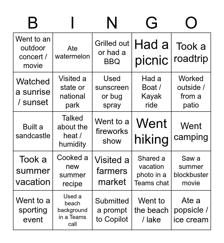This bingo card has 25 words: Took a summer vacation, Used a beach background in a Teams call, Went to a fireworks show, Went to the beach / lake, Took a roadtrip, Went to an outdoor concert / movie, Ate watermelon, Grilled out or had a BBQ, Went hiking, Saw a summer blockbuster movie, Watched a sunrise / sunset, Visited a state or national park, Submitted a prompt to Copilot, Shared a vacation photo in a Teams chat, Worked outside / from a patio, Went to a sporting event, Talked about the heat / humidity, Used sunscreen or bug spray, Had a Boat / Kayak ride, Went camping, Built a sandcastle, Cooked a new summer recipe, Visited a farmers market, Had a picnic and Ate a popsicle / ice cream.
