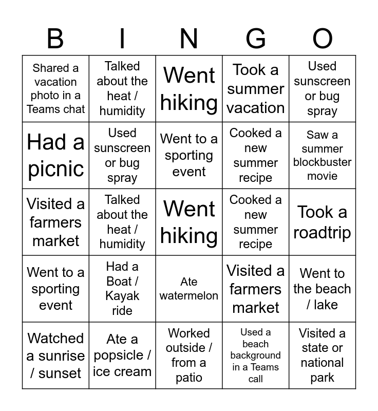This bingo card has 75 words: Watched a sunrise / sunset, Went to an outdoor concert / movie, Went to a sporting event, Used a beach background in a Teams call, Went to a fireworks show, Went to the beach / lake, Went camping, Built a sandcastle, Visited a farmers market, Took a roadtrip, Shared a vacation photo in a Teams chat, Submitted a prompt to Copilot, Ate watermelon, Cooked a new summer recipe, Visited a state or national park, Had a picnic, Ate a popsicle / ice cream, Worked outside / from a patio, Grilled out or had a BBQ, Saw a summer blockbuster movie, Had a Boat / Kayak ride, Talked about the heat / humidity, Went hiking, Took a summer vacation, Used sunscreen or bug spray, Watched a sunrise / sunset, Went to an outdoor concert / movie, Went to a sporting event, Used a beach background in a Teams call, Went to a fireworks show, Went to the beach / lake, Went camping, Built a sandcastle, Visited a farmers market, Took a roadtrip, Shared a vacation photo in a Teams chat, Ate watermelon, Submitted a prompt to Copilot, Cooked a new summer recipe, Visited a state or national park, Had a picnic, Ate a popsicle / ice cream, Worked outside / from a patio, Grilled out or had a BBQ, Saw a summer blockbuster movie, Had a Boat / Kayak ride, Talked about the heat / humidity, Went hiking, Took a summer vacation, Used sunscreen or bug spray, Went hiking, Used sunscreen or bug spray, Talked about the heat / humidity, Built a sandcastle, Had a picnic, Went to a fireworks show, Ate watermelon, Went to an outdoor concert / movie, Grilled out or had a BBQ, Cooked a new summer recipe, Watched a sunrise / sunset, Shared a vacation photo in a Teams chat, Submitted a prompt to Copilot, Took a roadtrip, Went camping, Visited a farmers market, Visited a state or national park, Ate a popsicle / ice cream, Worked outside / from a patio, Went to the beach / lake, Went to a sporting event, Had a Boat / Kayak ride, Saw a summer blockbuster movie, Used a beach background in a Teams call and Took a summer vacation.