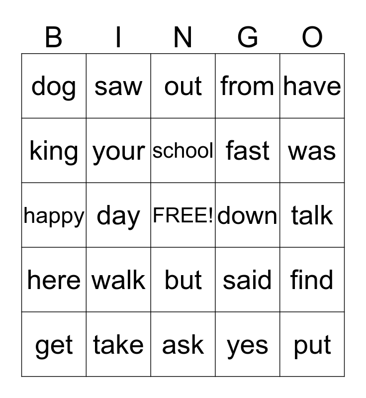 This bingo card has a free space and 24 words: walk, take, school, get, have, dog, king, saw, down, but, fast, happy, said, find, your, yes, talk, out, was, day, put, here, from and ask.