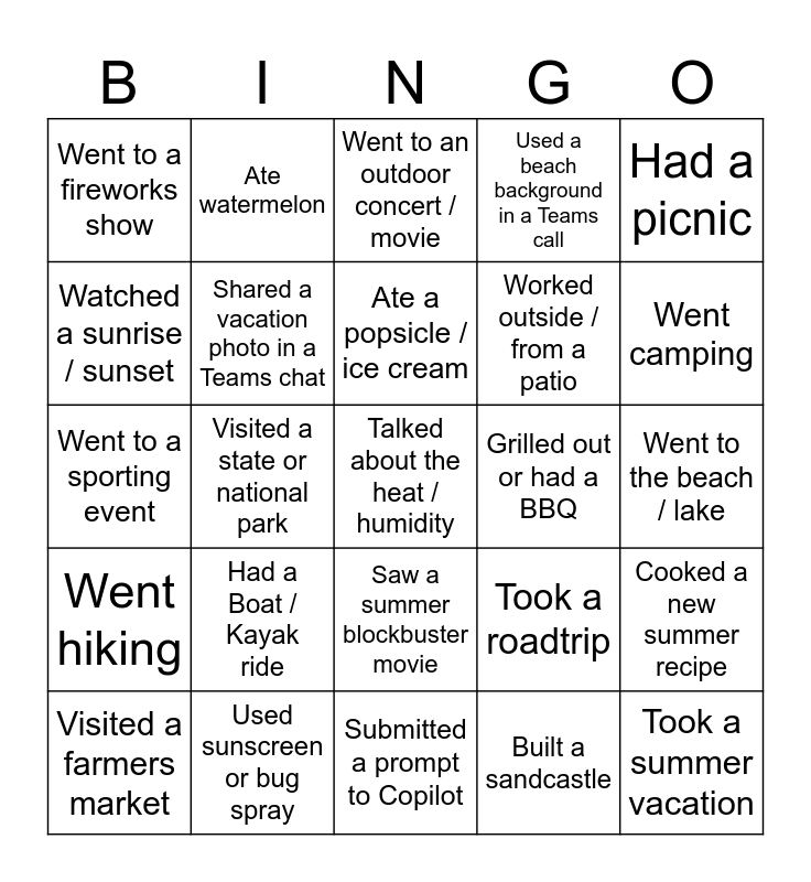 This bingo card has 25 words: Went hiking, Used sunscreen or bug spray, Talked about the heat / humidity, Built a sandcastle, Had a picnic, Went to a fireworks show, Ate watermelon, Went to an outdoor concert / movie, Grilled out or had a BBQ, Cooked a new summer recipe, Watched a sunrise / sunset, Shared a vacation photo in a Teams chat, Submitted a prompt to Copilot, Took a roadtrip, Went camping, Visited a farmers market, Visited a state or national park, Ate a popsicle / ice cream, Worked outside / from a patio, Went to the beach / lake, Went to a sporting event, Had a Boat / Kayak ride, Saw a summer blockbuster movie, Used a beach background in a Teams call and Took a summer vacation.