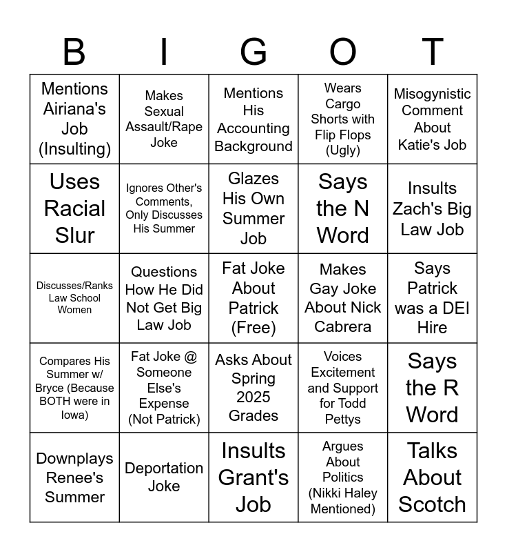This bingo card has a free space and 24 words: Fat Joke @ Someone Else's Expense (Not Patrick), Deportation Joke, Glazes His Own Summer Job, Downplays Renee's Summer, Misogynistic Comment About Katie's Job, Mentions Airiana's Job (Insulting), Uses Racial Slur, Makes Sexual Assault/Rape Joke, Makes Gay Joke About Nick Cabrera, Asks About Spring 2025 Grades, Says the N Word, Discusses/Ranks Law School Women, Voices Excitement and Support for Todd Pettys, Says the R Word, Ignores Other's Comments, Only Discusses His Summer, Argues About Politics (Nikki Haley Mentioned), Says Patrick was a DEI Hire, Mentions His Accounting Background, Insults Zach's Big Law Job, Questions How He Did Not Get Big Law Job, Talks About Scotch, Compares His Summer w/ Bryce (Because BOTH were in Iowa), Wears Cargo Shorts with Flip Flops (Ugly) and Insults Grant's Job.