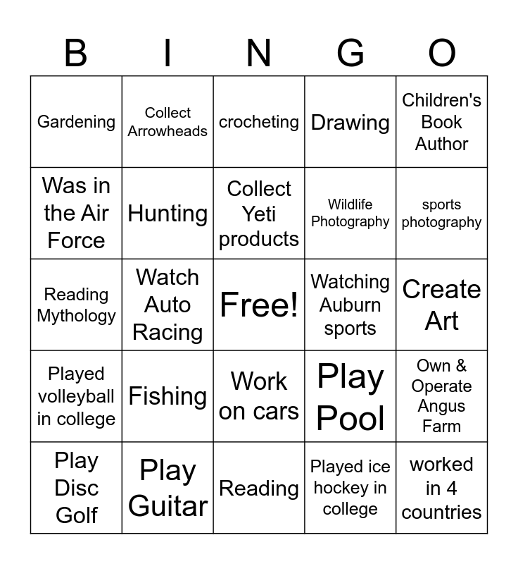 This bingo card has a free space and 26 words: Work on cars, Played ice hockey in college, Collect Yeti products, Play Guitar, Children's Book Author, Gardening, Was in the Air Force, Collect Arrowheads, Create Art, Play Pool, Wildlife Photography, Reading Mythology, Own & Operate Angus Farm, Play Disc Golf, Watch Auto Racing, Lived in seven States, Drawing, Played volleyball in college, crocheting, worked in 4 countries, sports photography, Reading, Watching Auburn sports, Fishing, Hunting and Camping.
