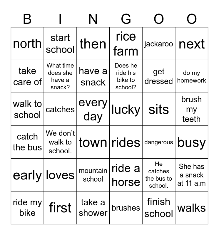 This bingo card has 36 words: ride a horse, mountain school, brushes, take care of, catch the bus, lucky, What time does she have a snack?, take a shower, jackaroo, He catches the bus to school., do my homework, rice farm, She has a snack at 11 a.m, catches, Does he ride his bike to school?, north, early, sits, walk to school, then, every day, We don’t walk to school., rides, town, dangerous, start school, get dressed, first, have a snack, next, walks, ride my bike, busy, brush my teeth, loves and finish school.