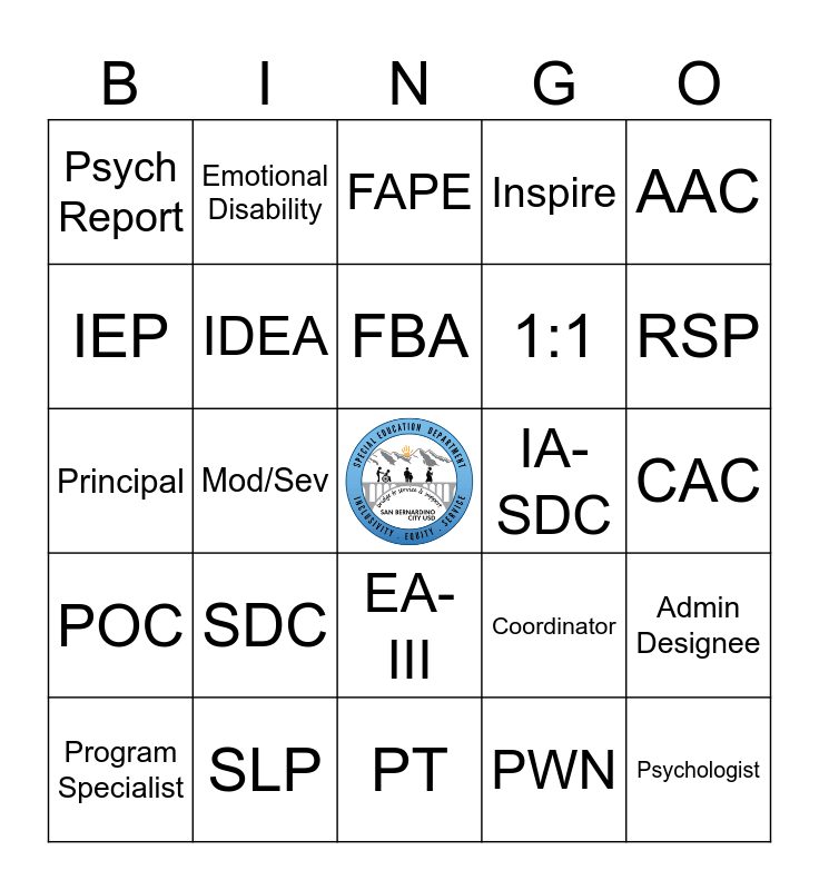 This bingo card has a free space and 29 words: Program Specialist, Transportation, Mod/Sev, IEE, Psych Report, FAPE, IDEA, SDC, IA-SDC, SLP, CAC, Psychologist, PT, PWN, RSP, APE, EA-III, POC, AAC, Principal, Coordinator, OT, 1:1, IEP, Inspire, Emotional Disability, Admin Designee, FBA and LRE.