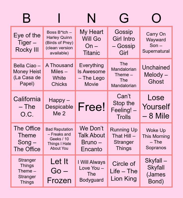 This bingo card has a free space and 30 words: Let It Go – Frozen, Shallow – A Star Is Born, Happy – Despicable Me 2, I See the Light – Tangled, Eye of the Tiger – Rocky III, My Heart Will Go On – Titanic, A Thousand Miles – White Chicks, We Don’t Talk About Bruno – Encanto, Can’t Stop the Feeling! – Trolls, I Will Always Love You – The Bodyguard, Lose Yourself – 8 Mile, Skyfall – Skyfall (James Bond), Circle of Life – The Lion King, All Star – Shrek, Unchained Melody – Ghost, I'll Be There for You – Friends, Running Up That Hill – Stranger Things, The Office Theme Song – The Office, Bad Reputation – Freaks and Geeks / 10 Things I Hate About You, Carry On Wayward Son – Supernatural, California – The O.C., Agatha All Along – WandaVision, Boss B*tch – Harley Quinn (Birds of Prey) (clean version available), The Mandalorian Theme – The Mandalorian, Bella Ciao – Money Heist (La Casa de Papel), Gossip Girl Intro – Gossip Girl, Woke Up This Morning – The Sopranos, Stranger Things Theme – Stranger Things, Everything Is Awesome – The Lego Movie and Bohemian Rhapsody – Wayne’s World / Bohemian Rhapsody.