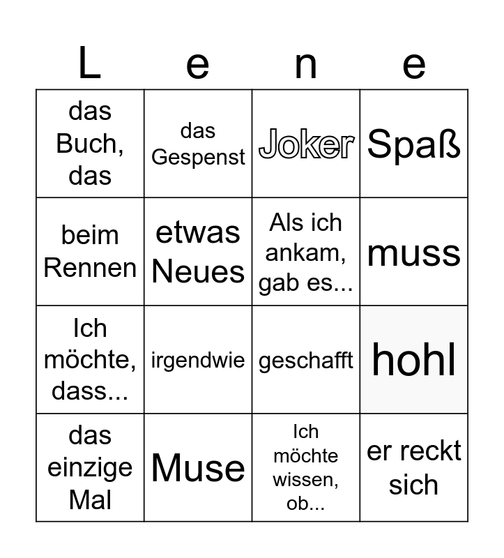 This bingo card has 16 words: Muse, hohl, Joker, das Buch, das, Ich möchte, dass..., das Gespenst, geschafft, Ich möchte wissen, ob..., beim Rennen, etwas Neues, das einzige Mal, Spaß, irgendwie, muss, Als ich ankam, gab es... and er reckt sich.