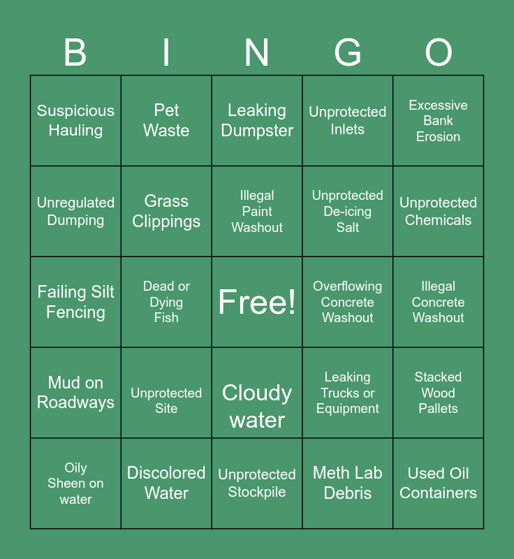 This bingo card has a free space and 39 words: Oil Dumping, Trash and Debris, Unprotected Portable Gas Cans, Grass Clippings, Oily Sheen on water, Cloudy water, Illegal Paint Washout, Leaves or Branches in Drains, Excessive Bank Erosion, Mud on Roadways, Dead or Dying Fish, Unprotected Inlets, Used Oil Containers, Illegal Concrete Washout, Overflowing Concrete Washout, Unprotected Site, Tipped Porta Potty, Suspicious Hauling, Missing Spill Kit, Leaking Trucks or Equipment, Unregulated Dumping, Unprotected Stockpile, Unprotected De-icing Salt, Unprotected Chemicals, Overflowing Dumpsters, Standing Water, Excessive Sediment Loads, Soapy Residues in water, Unlabeled Containers, Pet Waste, Yard fertilizer, Illegal Land Clearing, Leaking Dumpster, Discolored Water, Meth Lab Debris, Filled Catch Basin, Stacked Wood Pallets, Failing Silt Fencing and Improper Fueling Area.