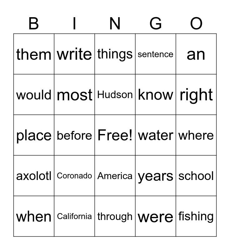 This bingo card has a free space and 24 words: Coronado, California, Hudson, when, an, them, would, write, water, America, know, place, years, school, most, were, where, things, right, before, fishing, axolotl, sentence and through.