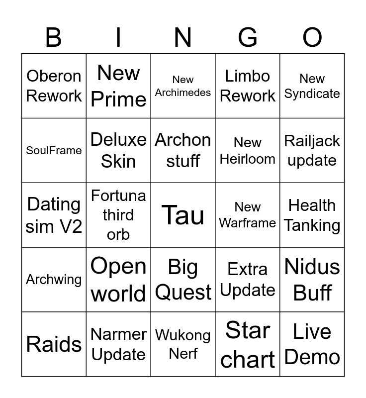 This bingo card has a free space and 24 words: Open world, Narmer Update, Archon stuff, Raids, New Syndicate, Oberon Rework, SoulFrame, New Prime, New Warframe, Big Quest, New Heirloom, Dating sim V2, Extra Update, Nidus Buff, Deluxe Skin, Star chart, Health Tanking, New Archimedes, Railjack update, Fortuna third orb, Live Demo, Archwing, Limbo Rework and Wukong Nerf.