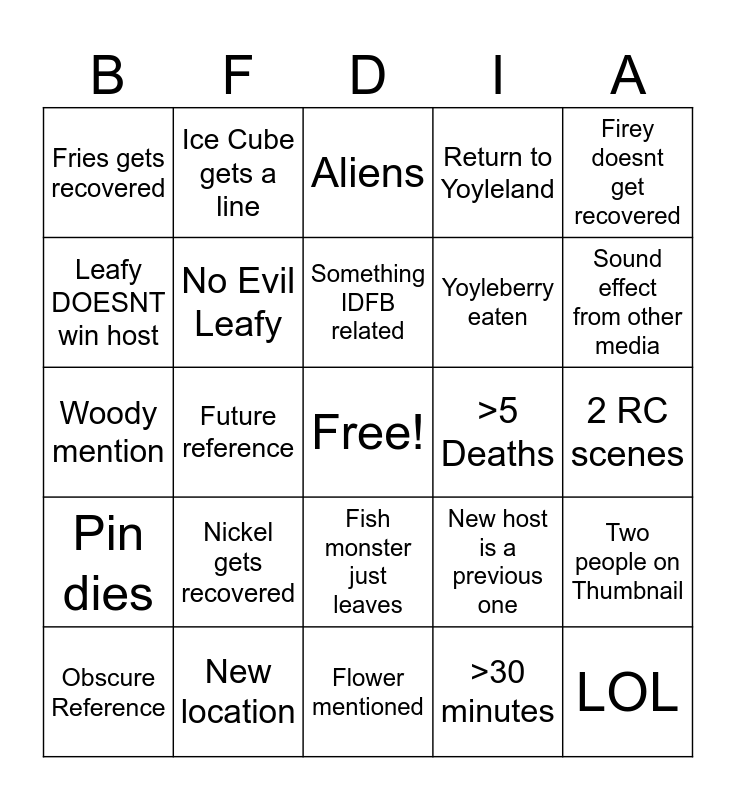 This bingo card has a free space and 24 words: Nickel gets recovered, New location, Something IDFB related, Obscure Reference, Firey doesnt get recovered, Fries gets recovered, Leafy DOESNT win host, Ice Cube gets a line, >5 Deaths, Fish monster just leaves, Yoyleberry eaten, Woody mention, New host is a previous one, Two people on Thumbnail, No Evil Leafy, >30 minutes, 2 RC scenes, Aliens, Sound effect from other media, Future reference, LOL, Pin dies, Return to Yoyleland and Flower mentioned.