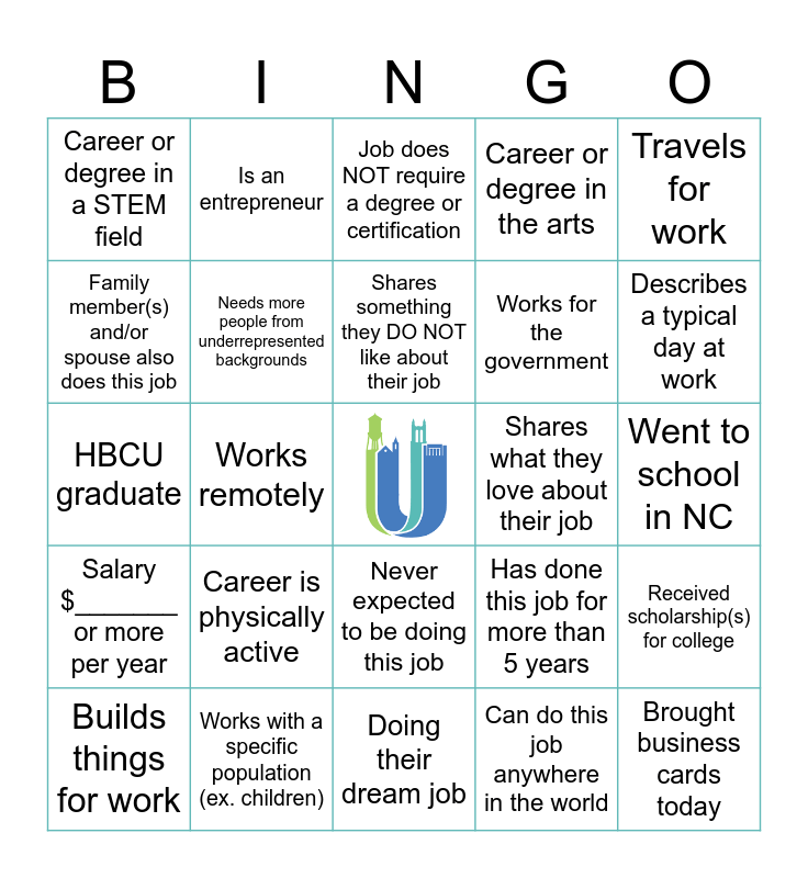This bingo card has a free space and 34 words: Job requires a diploma or degree, Can do this job anywhere in the world, Speaks more than one language, Job uses technology, Salary $_______ or more per year, Needs more people from underrepresented backgrounds, Travels for work, Builds things for work, Is an entrepreneur, Is a veteran, Shares something they DO NOT like about their job, Job does NOT require a degree or certification, Went to school out of state or internationally, Job requires a uniform, Shares what they love about their job, Describes a typical day at work, Works with a specific population (ex. children), HBCU graduate, Career is physically active, Has done this job for more than 5 years, Never expected to be doing this job, Has won award(s) for their work, Career or degree in a STEM field, Went to school in NC, Doing their dream job, Brought business cards today, Career or degree in the arts, Career focuses on health & wellness, Works for the government, Family member(s) and/or spouse also does this job, Works more than 40 hours per week, Works remotely, Received scholarship(s) for college and First generation college student.