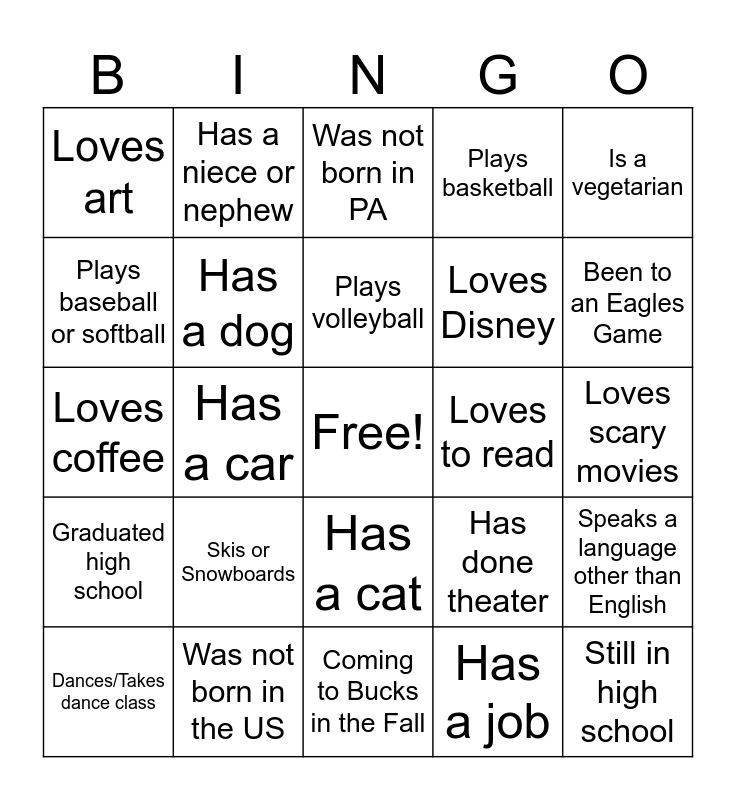 This bingo card has a free space and 35 words: Only child, Has a brother, Has a sister, Has a dog, Has a cat, Plays basketball, Plays baseball or softball, Plays soccer, Plays volleyball, Plays tennis, Loves coffee, Is a vegetarian, Loves Marvel movies, Likes to watch comedies, Loves art, Loves to read, Has a job, Has a car, Graduated high school, Still in high school, Has done theater, Dances/Takes dance class, Speaks a language other than English, Was not born in the US, Was not born in PA, Been to an Eagles Game, Been to a Phillies Game, Loves the Beach, Loves Disney, Loves scary movies, Plays an instrument, Coming to Bucks in the Fall, Skis or Snowboards, Has a niece or nephew and Has visited another country.