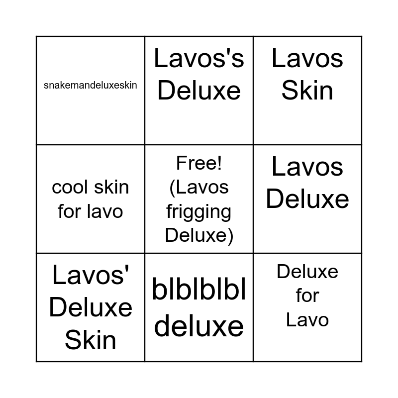 This bingo card has a free space and 8 words: Lavos Deluxe, Lavos Skin, Lavos's Deluxe, Lavos' Deluxe Skin, snakemandeluxeskin, Deluxe for Lavo, cool skin for lavo and blblblbl deluxe.