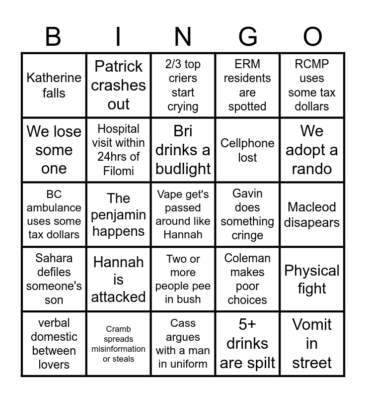 This bingo card has 25 words: Hannah is attacked, Cass argues with a man in uniform, Bri drinks a budlight, verbal domestic between lovers, RCMP uses some tax dollars, Katherine falls, We lose some one, Patrick crashes out, Gavin does something cringe, Two or more people pee in bush, Cellphone lost, BC ambulance uses some tax dollars, Coleman makes poor choices, Physical fight, Hospital visit within 24hrs of Filomi, Vomit in street, Macleod disapears, 2/3 top criers start crying, We adopt a rando, The penjamin happens, Vape get's passed around like Hannah, Cramb spreads misinformation or steals, Sahara defiles someone's son, ERM residents are spotted and 5+ drinks are spilt.