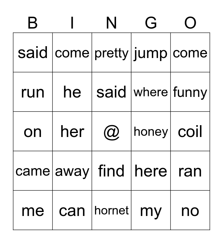 This bingo card has a free space and 24 words: away, can, said, me, come, said, run, come, honey, find, where, on, here, ran, he, my, coil, pretty, funny, her, no, came, jump and hornet.