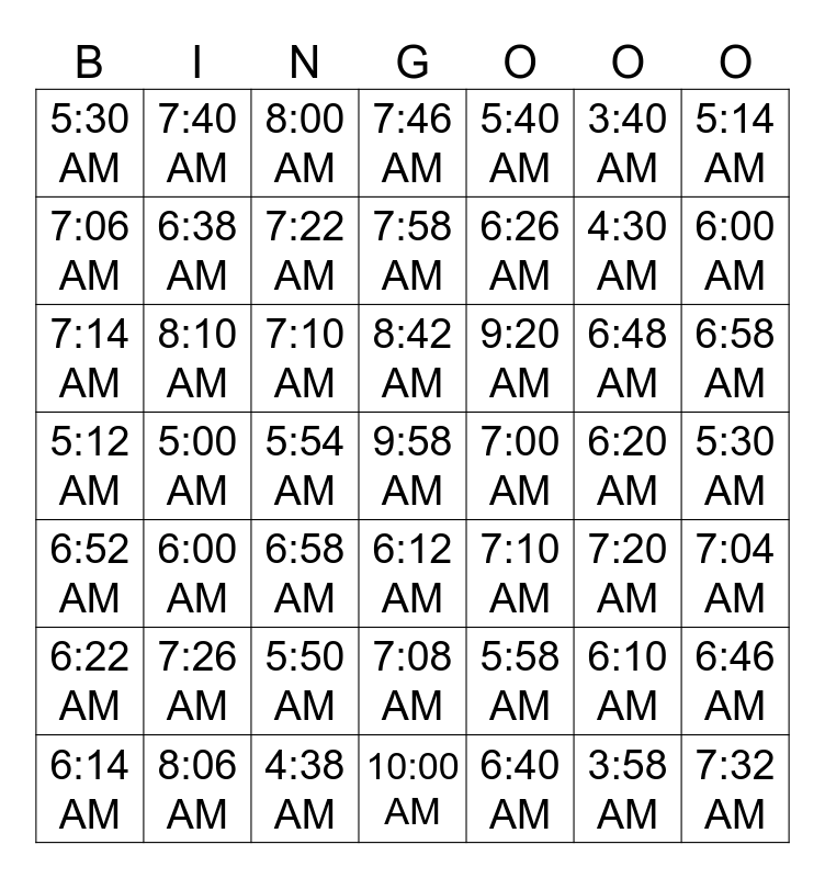 This bingo card has 49 words: 6:10 AM, 4:30 AM, 6:40 AM, 5:00 AM, 7:10 AM, 5:30 AM, 7:40 AM, 4:38 AM, 3:40 AM, 6:12 AM, 5:14 AM, 7:46 AM, 6:48 AM, 9:20 AM, 7:26 AM, 6:20 AM, 7:06 AM, 6:00 AM, 6:46 AM, 5:40 AM, 6:26 AM, 5:54 AM, 5:30 AM, 6:38 AM, 6:14 AM, 7:22 AM, 6:58 AM, 8:06 AM, 8:42 AM, 8:10 AM, 7:32 AM, 7:00 AM, 6:22 AM, 5:50 AM, 5:12 AM, 7:10 AM, 7:20 AM, 7:04 AM, 7:14 AM, 6:58 AM, 7:08 AM, 6:52 AM, 9:58 AM, 10:00 AM, 7:58 AM, 8:00 AM, 5:58 AM, 6:00 AM and 3:58 AM.