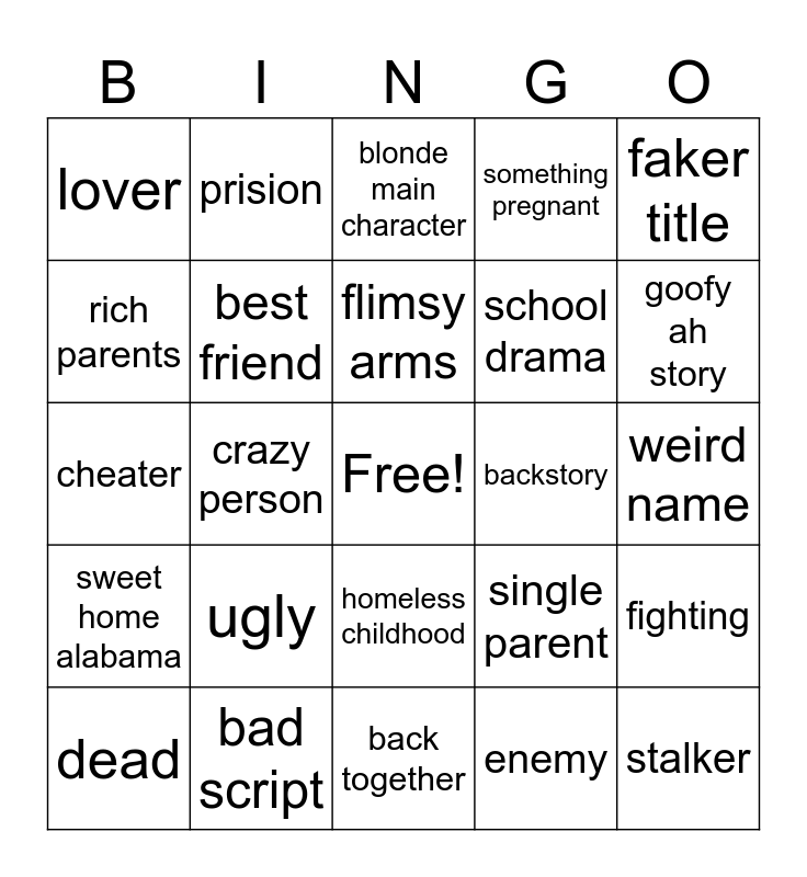 This bingo card has a free space and 24 words: ugly, bad script, flimsy arms, dead, faker title, lover, rich parents, prision, backstory, homeless childhood, school drama, cheater, single parent, fighting, best friend, enemy, weird name, blonde main character, goofy ah story, crazy person, stalker, sweet home alabama, something pregnant and back together.