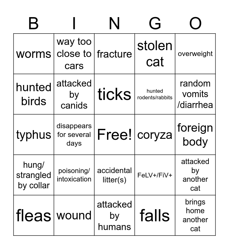 This bingo card has a free space and 24 words: poisoning/ intoxication, wound, ticks, fleas, overweight, worms, hunted birds, way too close to cars, coryza, accidental litter(s), hunted rodents/rabbits, typhus, FeLV+/FiV+, attacked by another cat, attacked by canids, falls, foreign body, fracture, random vomits /diarrhea, disappears for several days, brings home another cat, hung/ strangled by collar, stolen cat and attacked by humans.