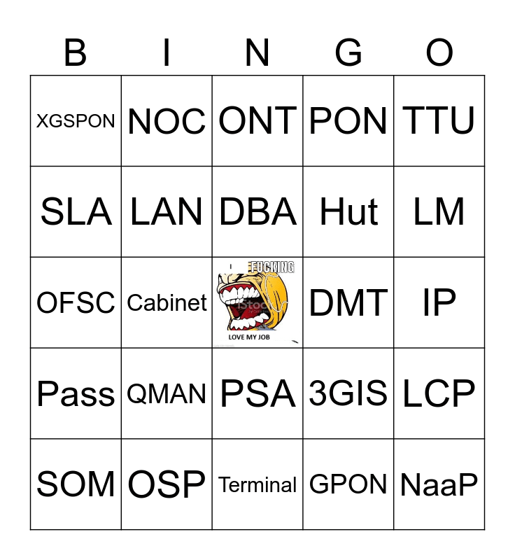 This bingo card has a free space and 24 words: QMAN, OSP, DBA, SOM, TTU, XGSPON, SLA, NOC, DMT, PSA, Hut, OFSC, 3GIS, LCP, LAN, GPON, IP, ONT, LM, Cabinet, NaaP, Pass, PON and Terminal.