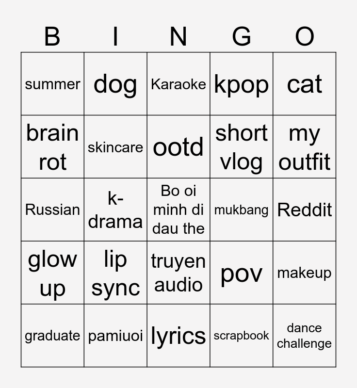 This bingo card has a free space and 24 words: lip sync, pamiuoi, ootd, graduate, cat, summer, brain rot, dog, mukbang, truyen audio, short vlog, Russian, pov, makeup, skincare, scrapbook, Reddit, Karaoke, my outfit, k-drama, dance challenge, glow up, kpop and lyrics.