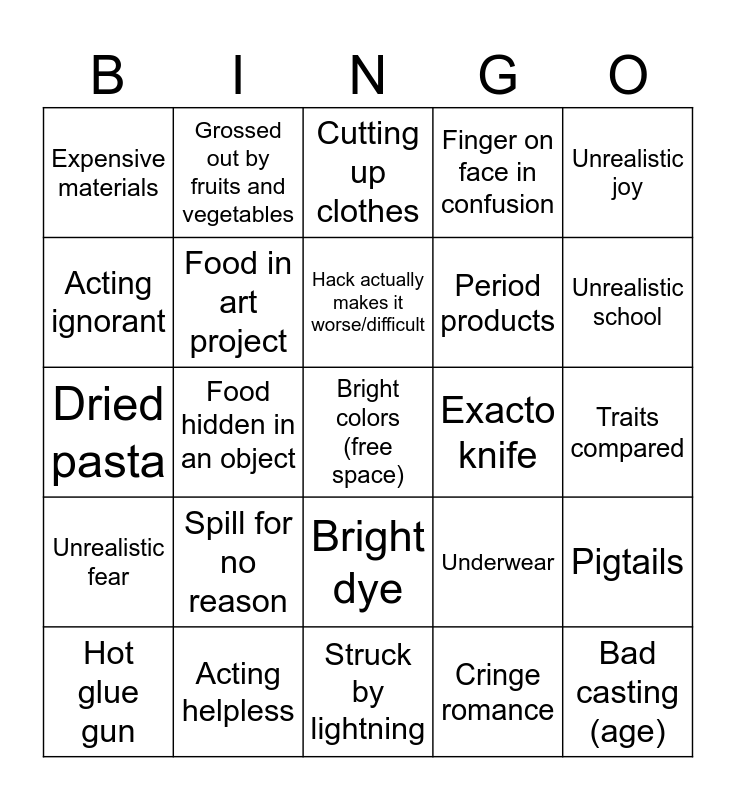 This bingo card has a free space and 29 words: Hot glue gun, Toothpaste, Food hidden in an object, Prank, Expensive materials, Cutting up clothes, Food in art project, Spill for no reason, Exacto knife, Acting helpless, Traits compared, Bad casting (age), Struck by lightning, Cringe romance, Unrealistic school, Uses weird body parts when cooking, Bright dye, Unrealistic fear, Unrealistic joy, Dried pasta, Underwear, Lipstick, Period products, Acting ignorant, Finger on face in confusion, Grossed out by fruits and vegetables, Pigtails, Hack actually makes it worse/difficult and Ugly fashion hacks.