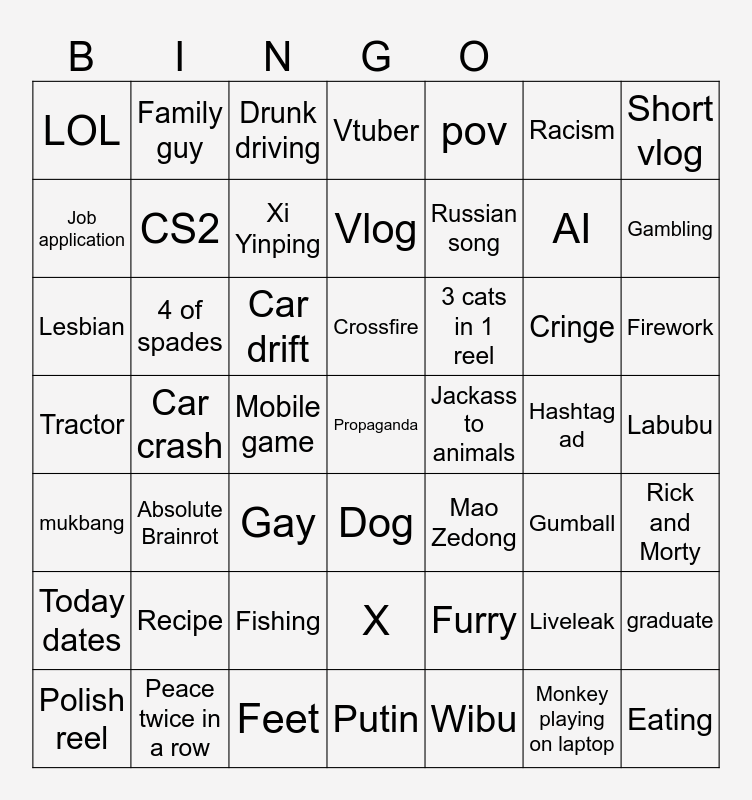 This bingo card has 49 words: Liveleak, AI, Wibu, Car crash, Car drift, Labubu, Family guy, Feet, Racism, Dog, Short vlog, Vtuber, Cringe, 3 cats in 1 reel, Recipe, Hashtag ad, Job application, Gambling, graduate, pov, Russian song, Mobile game, LOL, CS2, Polish reel, Xi Yinping, Firework, Peace twice in a row, Crossfire, 4 of spades, Eating, Jackass to animals, Today dates, Fishing, Tractor, Mao Zedong, Gumball, Rick and Morty, Lesbian, Gay, X, mukbang, Propaganda, Putin, Vlog, Drunk driving, Furry, Absolute Brainrot and Monkey playing on laptop.