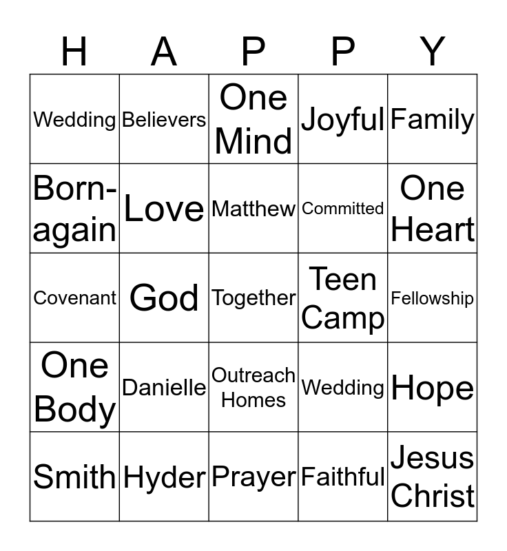 This bingo card has a free space and 24 words: Danielle, Hyder, Matthew, Smith, Family, Wedding, Born-again, Believers, Teen Camp, Outreach Homes, Committed, Covenant, Wedding, Hope, Love, Faithful, Fellowship, One Mind, One Heart, God, Jesus Christ, One Body, Joyful and Prayer.